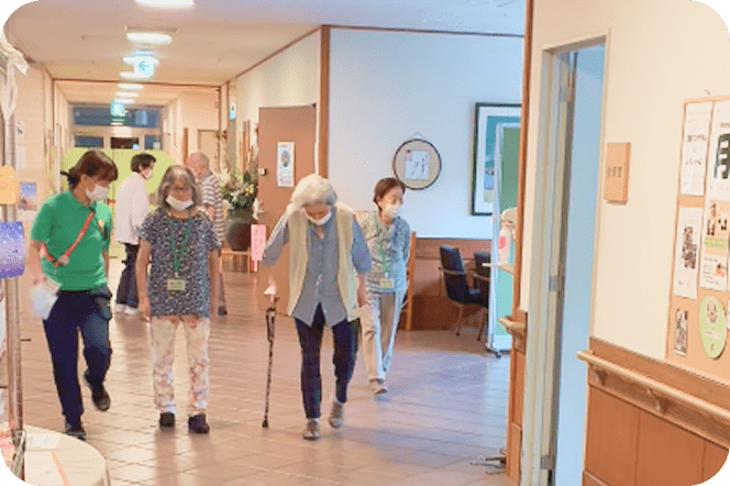 ウォーキングクラブは、館内の廊下を歩くため、天候に左右されず、職員の目が行き届いた安心安全な環境で行うことができます。歩行が難しい方にはスタッフが付き添いながら気軽にご参加いただけます。