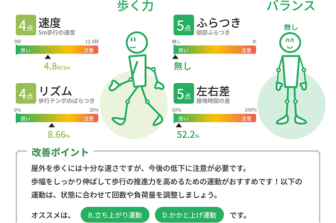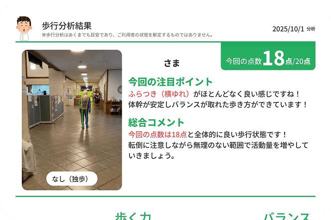 また、AIツールを使った測定を行い、速度・リズム・ふらつき・左右差の観点から歩行分析を実施しております。生活動作の基本である「歩行」をしっかり、コツコツと積み重ねていくことで、あらゆるリハビリの基礎を築き、生活の幅を広げます。