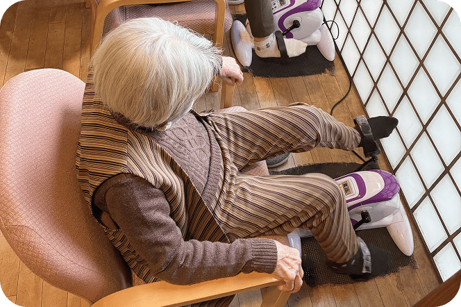 エルゴメーターを使ったトレーニングで、膝や腰に負担をかけずに有酸素運動が行え、体力維持や心肺機能の向上に効果的です。窓の外の景色を眺めながら取り組めるため、気分もリフレッシュできます。自然光の中での運動は、心身ともにリラックスしながら続けられると好評です。