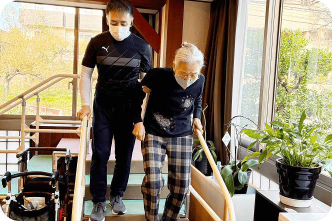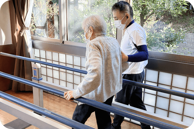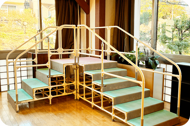 特注の階段を使った昇降訓練では、実際の生活動作に近い動きを安全に練習できます。段差の高さや手すりの位置にもこだわり、利用者様一人ひとりの体力やペースに合わせて無理なく取り組めます。階段や段差を越える際に感じる不安を軽減し、日常生活の幅を広げます。