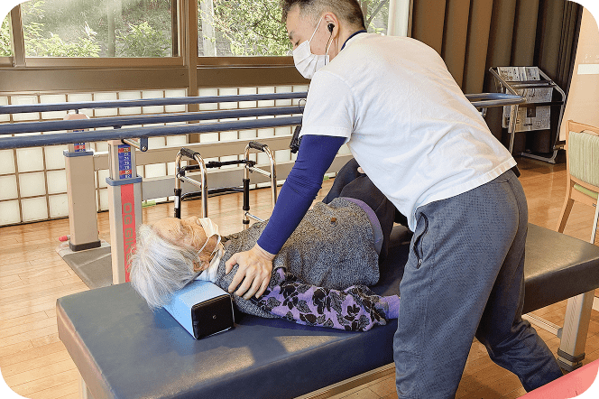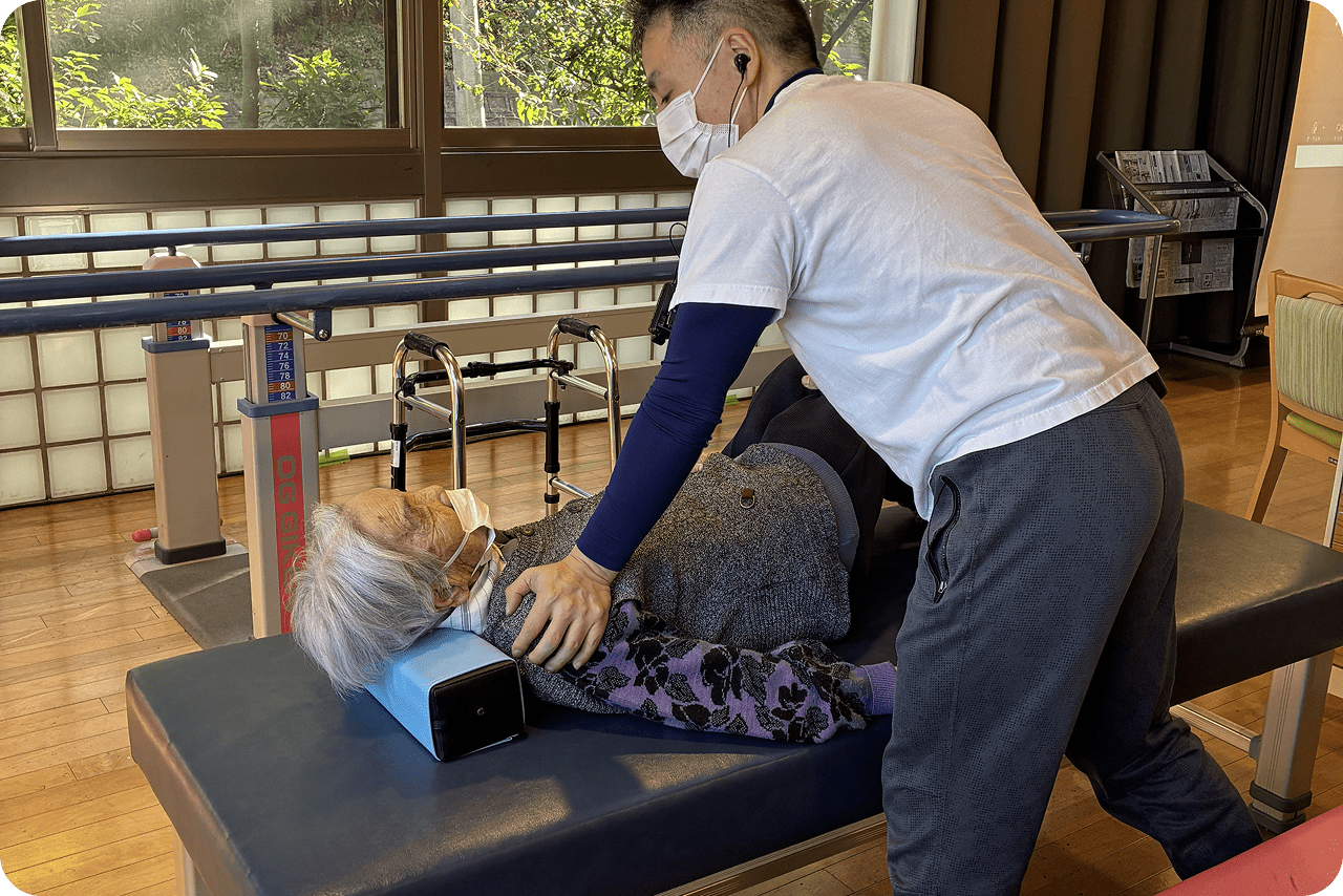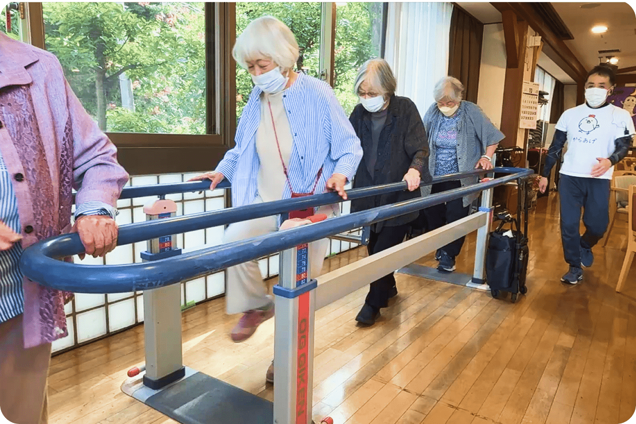 ケアタウン成増では、安心・安全な環境で、少しずつ続けられるリハビリを提供しています。専従の指導員による日々のメニューをはじめ、eスポーツや健康音楽クラブなど、楽しみながらできるプログラムもございます。また、広い館内で生活することで、自然と運動になる、日常生活動作がリハビリになるといった、「生活リハビリ」を実践できることも特徴の一つです。