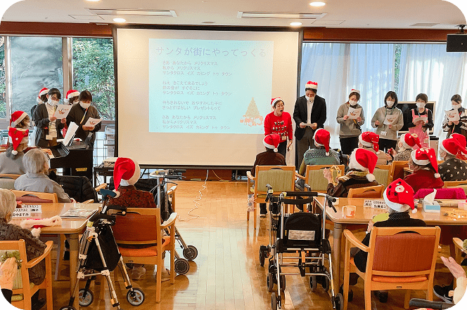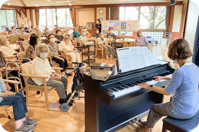 安全で広い館内を活かした、体を動かすアクティビティや、音楽療法なども取り入れることで、楽しみながら心身の活性化を図ります。さまざまなイベントを通じて、日々の生活に新しさと彩りを加え、利用者様一人ひとりの生活の質の向上を目指しています。