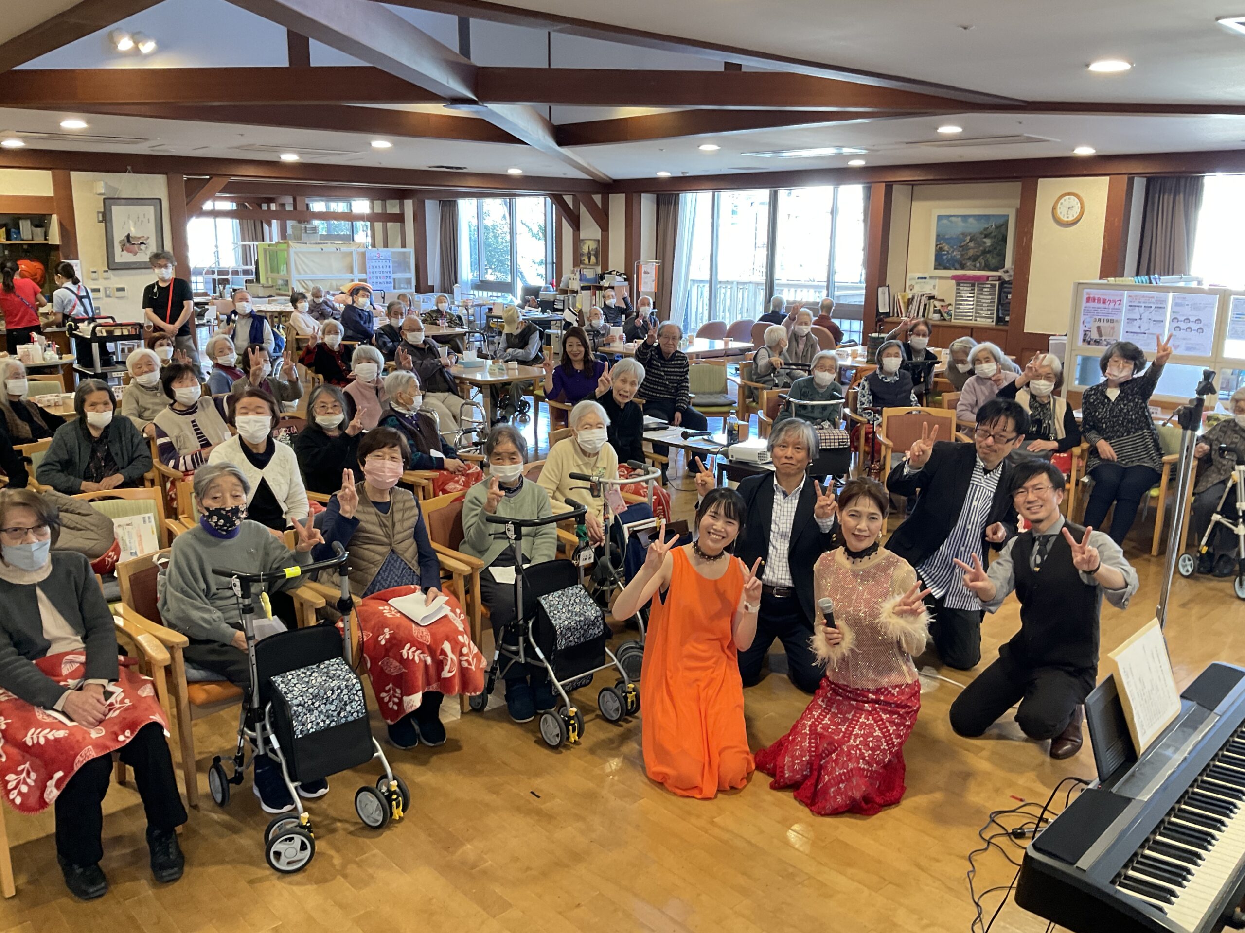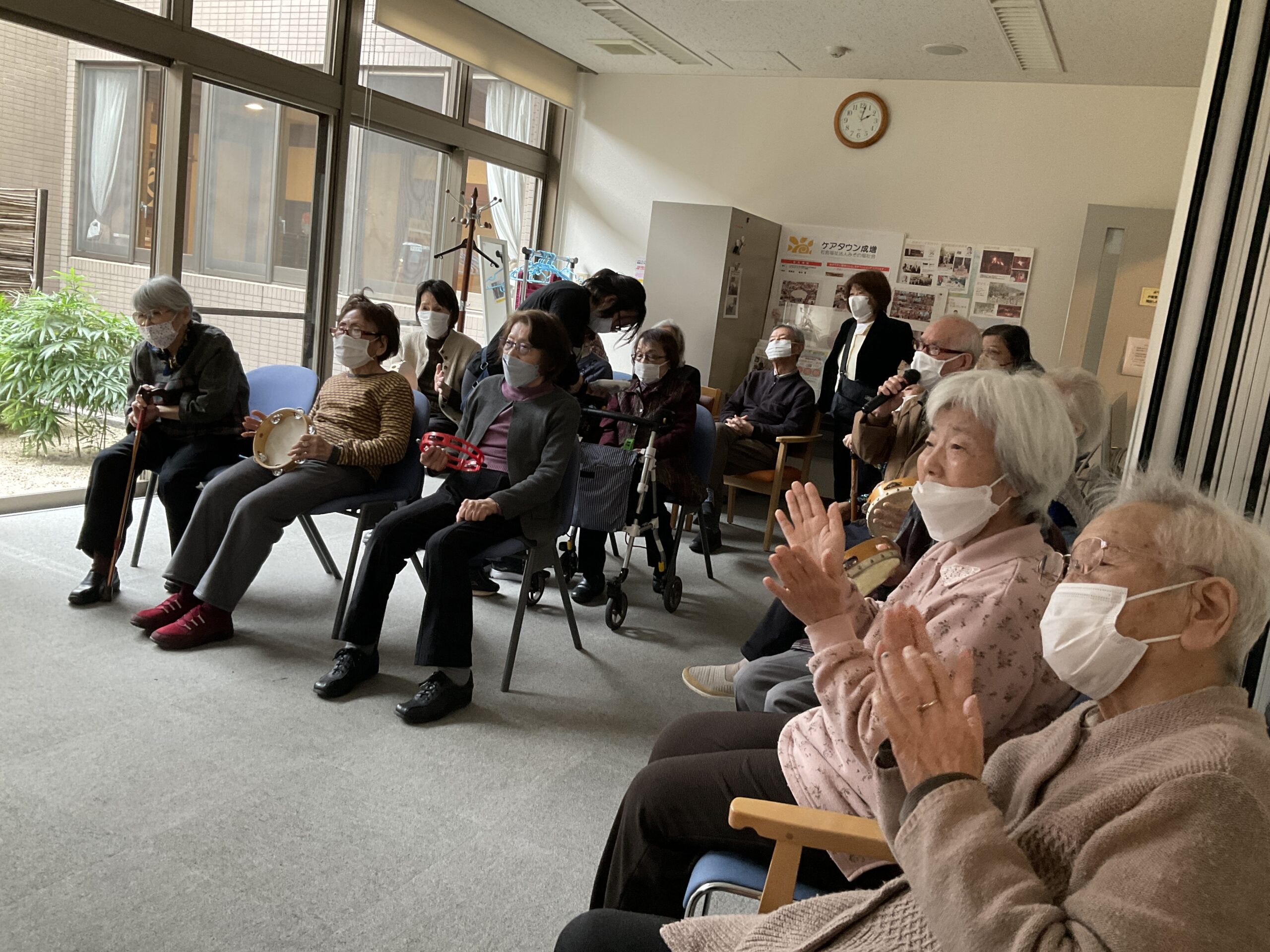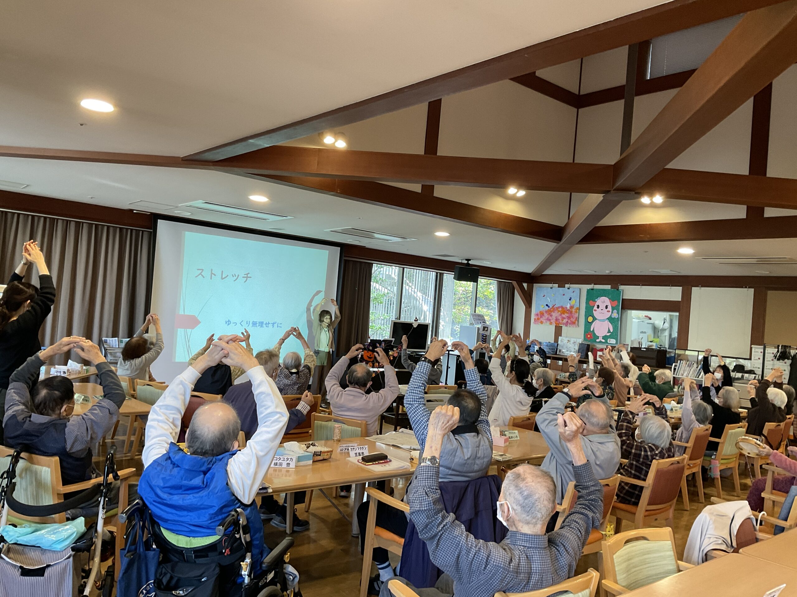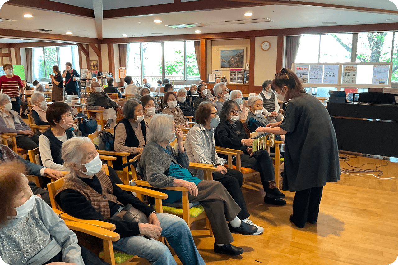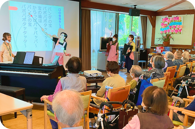 音楽療法士とボランティアが月に一度、歌や楽器を通じて活動を行います。音楽に合わせて体を動かすことで、楽しみながら身体機能や脳の活性化を促し、交流の機会も自然に促進します。