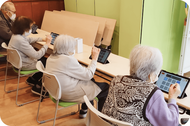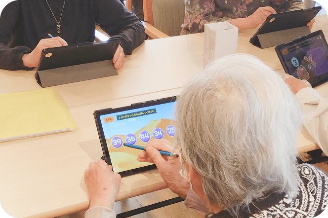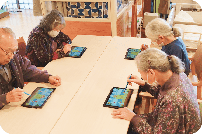 デイサービスでは、タブレットを使った「スーパーブレイン脳トレ」を取り入れ、楽しみながら脳の働きを活性化する時間を設けています。無理なく続けられる内容で、記憶力や判断力の維持にもつながり、日々の健康づくりの一助として多くの方にご参加いただいています。