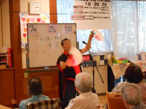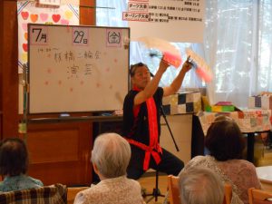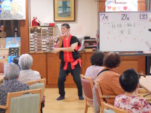 カスタネットをリズム良く鳴らしながら「浪花節だよ人生は」の歌から始まり、扇子の舞では、演技に合わせて、両手を動かす利用者様もおり、皆さん楽しまれていました。