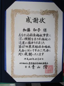 第65回東京都社会福祉大会において、加藤和子様の今年で9年目を迎えた入所者の話し相手としての傾聴ボランティア活動が「東社協会長感謝」を受賞しました。