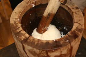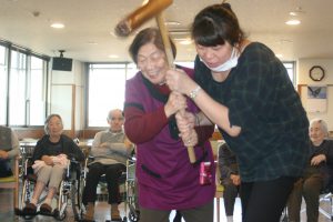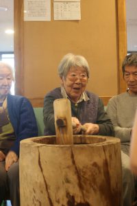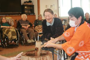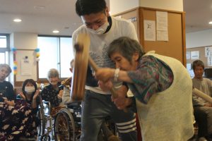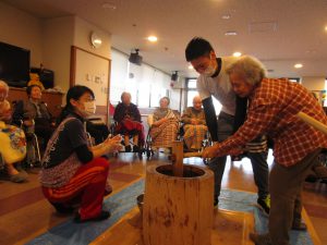 1/18 毎年恒例となっています餅つき大会を行いました。 デイサービス→特養2階→特養3階と各フロアを巡りました。ご利用者の皆様とご一緒に昔を懐かしみつつ、大きな掛け声とともにおもちをつきました。笑顔の絶えない楽しいお餅つき大会になりました。