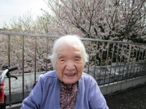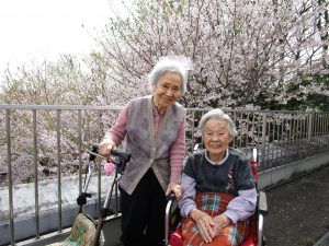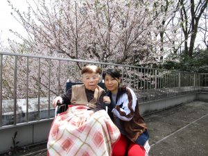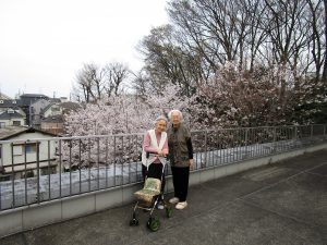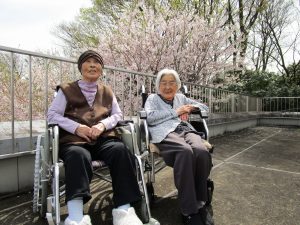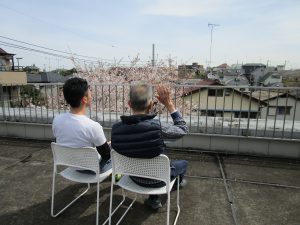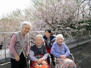 施設の周辺の桜の花も満開となり、入居者の皆様ご一緒にテラスにてお花見を行いました。