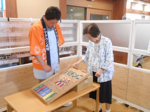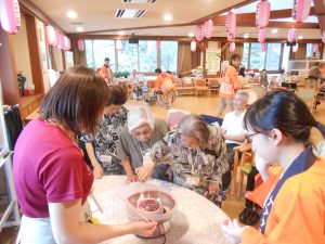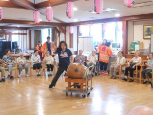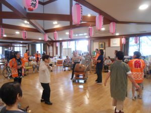 まずはフロア中央で「炭坑節」「東京音頭」に合わせ職員が太鼓をたたき、利用者の皆さんと盆踊りを踊りお祭り気分を盛り上げました。