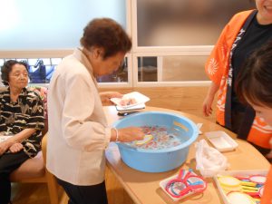 盆踊りの後は、パチンコ、金魚すくい、お手玉バスケのゲームコーナーを回っていただき、今年の目玉、わたがし作り体験をしていただきました。この日の為にわたがし機を購入した甲斐があり、皆さん童心に帰った様に笑顔で楽しまれていました。