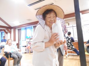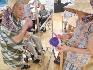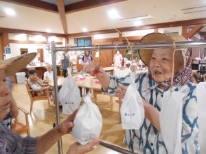 利用者の皆さんには1チーム6人で2人一組のペアになっていただき、袋に入ったぶどう等を吊るして、1人はハサミで紐を切る係、1人は袋を持つ係になっていただきました。袋の中身は…本物のぶどう、紙で作った、ぶどう、なす、むらさき玉ねぎが入っており、それぞれに点数決め、取った中身の合計点で競いあいました。