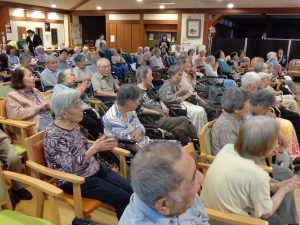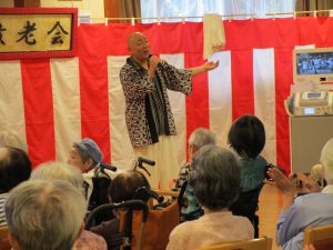 9/10(日)、ご入居者の皆様にささやかではありますが、長寿のお祝いとして敬老会を開かせていただきました。今年度はガンバ小正さんをお招きして、ものまね歌謡ショーを行っていただきました。皆様、ガンバ小正さんの様々な音色の歌声に笑顔で聞き入っていました。その後、記念のお菓子の贈呈を行い、今年賀寿を迎える19名の方を始め、入居者の皆様には楽しい敬老会を過ごしていただきました。 敬老会終了後、「家族会」もあわせて開催しました。日々の施設での援助方法の報告や今後の予定(健康管理等について)、意見交換等とても貴重な時間となりました。