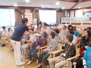 次に大竹機能訓練指導員によるバレエの披露、鈴木職員によるマジックショーと続き、最後に本日、ご利用の賀寿者の皆さんの集合写真を撮影して盛り上がりの中、敬老会が終わりました。