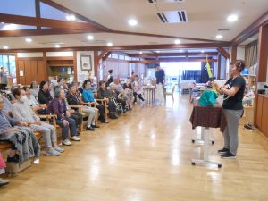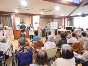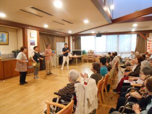 敬老会では、デイサービスの課長からお祝いのスピーチ、色紙の贈呈を行い、職員の出し物で楽しんでいただきました。