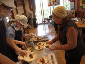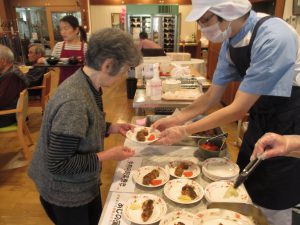 お食事の前に・・・各テーブルで皆様お茶を入れたりテーブルを拭いたりと準備を積極的にやっていただいています。