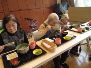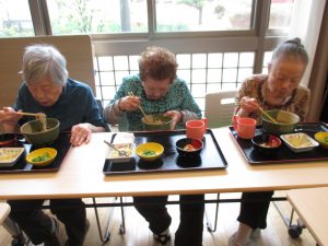 毎月1回実施している“合同ランチ”。本日は、特養5名、デイサービス4名が集まりアットホームなランチ会を行いました。