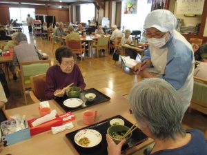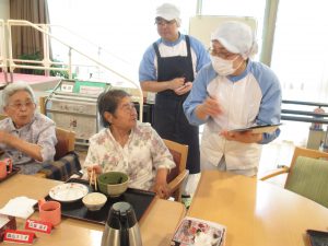 本日は、デイサービスへ厨房職員が食事の時間に合わせてお話をうかがいに行きました。