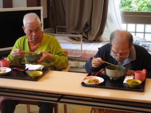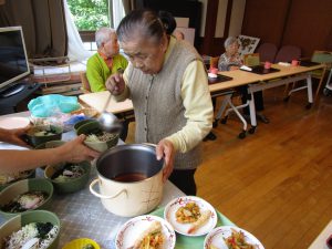 6月は父の日ということで、今月は女性の利用者様に盛り付けをお願いしました。慣れた手つきでお皿に盛り付けていました。蒸し暑い日でしたがわかめそばが食欲をそそり、お話も弾んでいました。