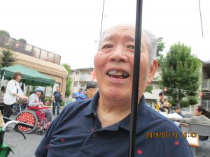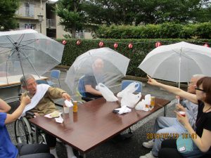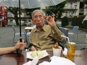 7/13(土)赤塚福祉園様からご招待を受け、夏祭りに行って参りました。今回の参加者は全員男性のご利用者で珍しい外出となりました。小雨が降っていましたが、出店では焼きそば・唐揚げ・肉まんなどお好きな物を購入しその場で頂きました。隣で傘を差す職員を見て「俺が持つよ」と自然に手を出して下さる紳士な対応に職員一同感激してしまいました。梅雨空の外出でしたが一足先にお祭りの雰囲気を感じることができました。