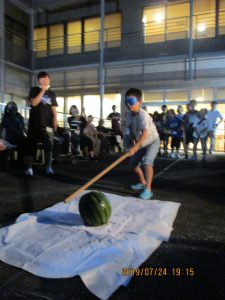 子供食堂に参加している子供達やご家族様も参加され、大人数で大変賑わい利用者様達もとても楽しそうにされていました。かき氷を食べたり、ジュースを飲んだりしながら夜風にあたり、夏を感じる事が出来ました。スイカ割に挑戦してくれた子供たちに向って、利用者様もご家族の皆様も一体となって「もっと右だよ!」「もっと前だよ!」と的確に誘導してくれた為、10回程で見事にスイカが割れました。