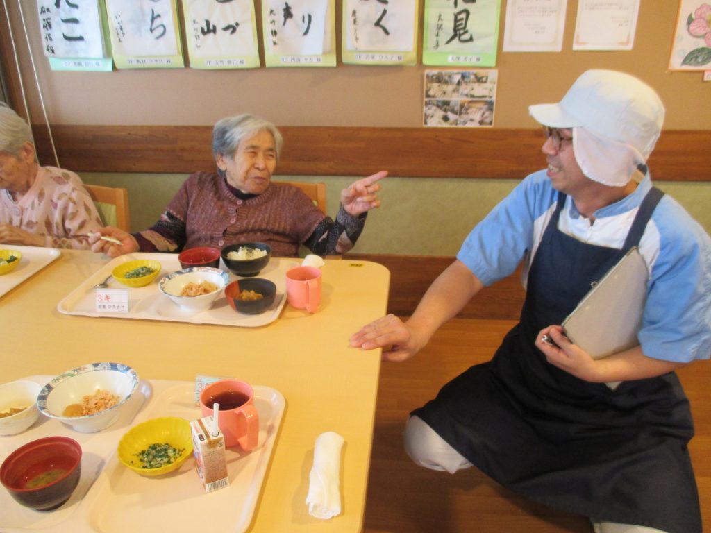 本日は、特養・ショートステイのフロアへ厨房職員が食事の時間に合わせてお話をうかがいに行きました。