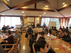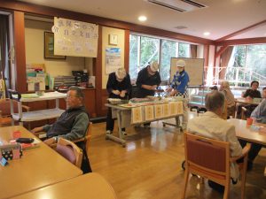 本日の昼食はにぎり寿司です。ご利用者様は「お寿司屋さんが来たみたい」と目の前で職人さんが握る手元を真剣な眼差しで見ていました。一人前(6貫)とお吸い物、小鉢。お膳が運ばれると皆様、笑顔で召し上がられてました。おかわりもあり皆様、「おいしかった」と満足され賑やかな昼食の時間となりました。