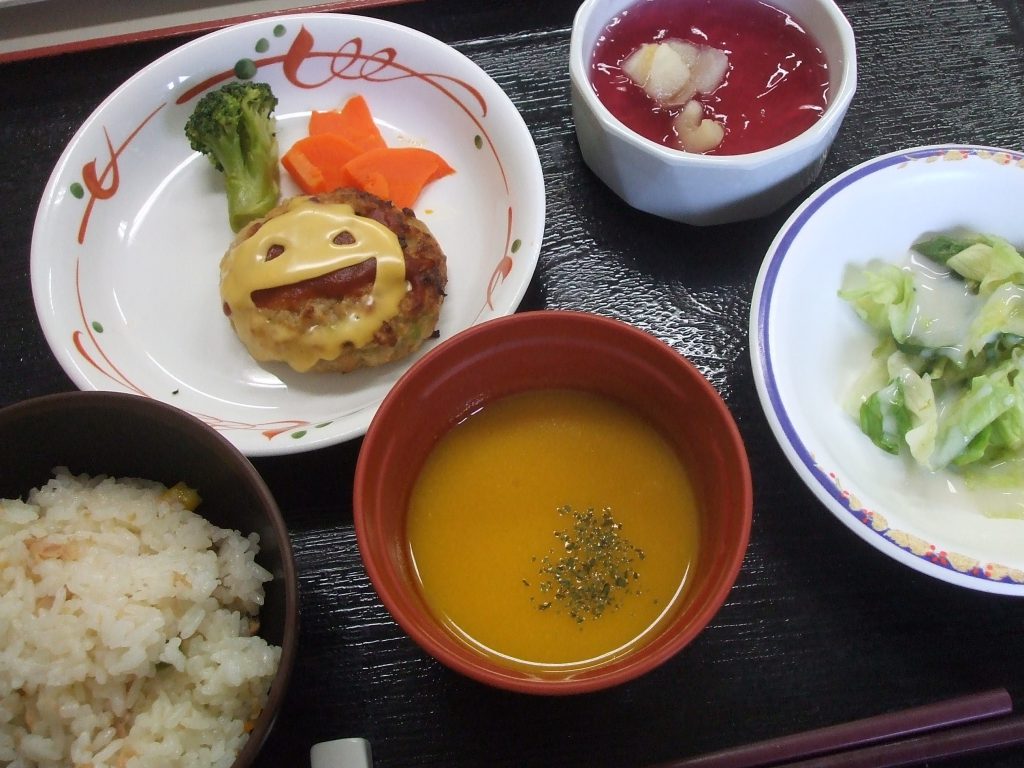 本日の昼食はハロウィンメニュー。かぼちゃのおばけの形にくりぬいたチーズをのせたハンバーグ。