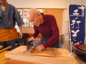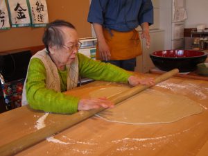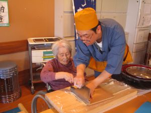本日は食堂調理スタッフによるそば打ちイベントを二階フロアで行いました。そばを打っている様子を皆さん興味津々で見ていました。その後何名かの利用者様に実際にそばを伸ばす等の体験をして頂きました。体験された方皆さん「上手に伸ばすのも、細く切るのも難しいね」と笑って話されていました。昼食には生そばと天ぷらの盛り合わせが提供され「とても美味しい」と会話を楽しみながら召し上がっていました。