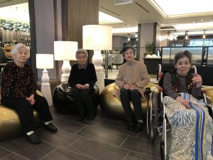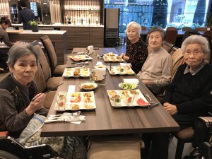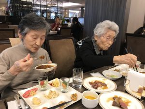 その場でカットされるローストビーフや削りたてのチーズをのせていただくお肉のパスタなど洋食がメインのメニューでした。ご自分で並んでいるお料理を好みに合わせて選ばれるのもとても楽しいご様子で、ケーキやフルーツのデザートと淹れたての美味しいコーヒーまでしっかり召し上がり、気分良くお話にも花が咲きとても明るいお食事会となりました。