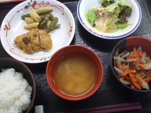 本日のメニューは、“ご飯・みそ汁・鶏肉のカレー風味焼き・ごぼうの炒り煮・グリーンサラダ”でした。
