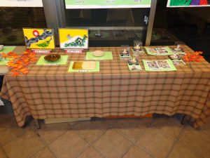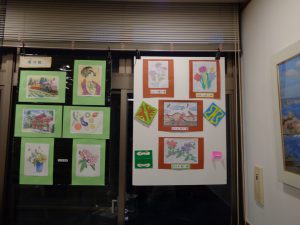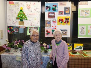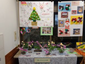 11月28日より、1階ロビーにて「秋の作品展示会」が始まりました。特養の利用者様は書道や陶芸、生け花などを出品しています。また、バスハイクで行った富岡製糸場で作成した『繭人形』も展示しています。大きな貼り絵は子ども食堂の子どもたちの作品です。クリスマスということで、ツリーになっていますが、ペットボトルの蓋を使い細部までこだわった作品になっています。その他にもデイサービスの利用者様の作品や成増ヶ丘小学校4年生の作品を数多く展示しております。開催期間は12/8(日)まで。(9:00~18:00)