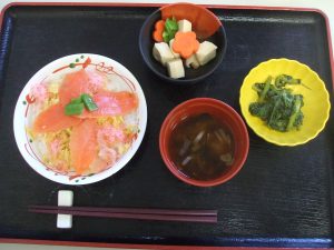 本日のメニューは、“サーモンちらし寿司・赤だし汁・高野豆腐の煮物・春菊の柚子醤油和え”でした。