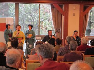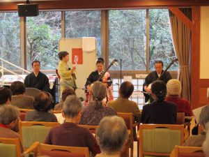 本日、民謡「川椿会」の皆さんが、新春民謡アトラクションとして、三味線、太鼓、尺八の演奏と唄で民謡の演奏会を開催して下さいました。独唱「南部俵積み唄(南部地方)」「秋田人形甚句(秋田県)」他4曲、その他演歌2曲や九州炭坑節と東京音頭は踊りもあり、沢山の曲を披露して下さり第一部が終了!