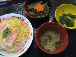 本日のメニューは、“海老ちらし寿司・すまし汁・牛肉とごぼうの含め煮・菜の花の信田和え”でした。