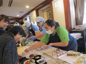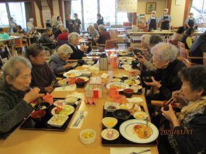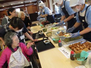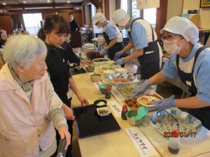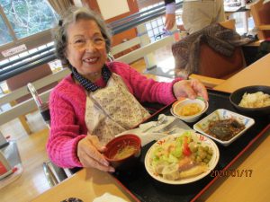 今日は待ちに待ったバイキンGooー♪の日です!トレイを持って並び目の前の料理を選びます。迷いながら選んだ後は笑顔に‼「こんなの初めてだ」と、嬉しそうに召し上がっていらっしゃいました。もちろんおかわりも出来ます。皆さんいつも以上に笑顔でお食事を召し上がっていらっしゃいました。次回が楽しみです!