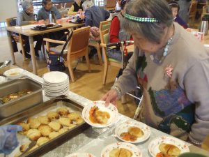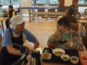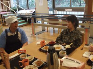 本日は、デイサービスのフロアへ厨房職員が食事の時間に合わせてお話をうかがいに行きました。