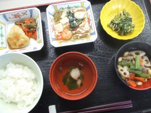 本日のメニューは、“ごはん、すまし汁、主菜セレクト(お魚ハンバーグ又は海老と豆腐の旨煮)、