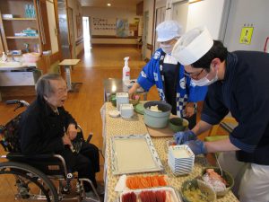 利用者の皆さんが待ちに待った、にぎり寿司イベントが行われました。
