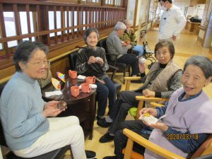 他の階の方との交流もあり「たまにはこうやって色んな方とお話しできるのはいいわね」と楽しんで下さっています。