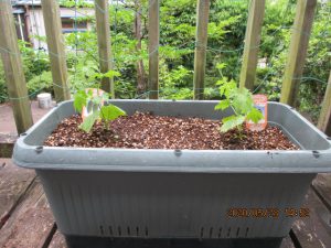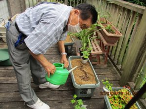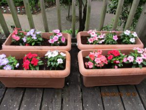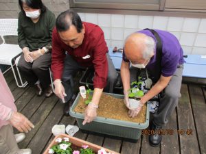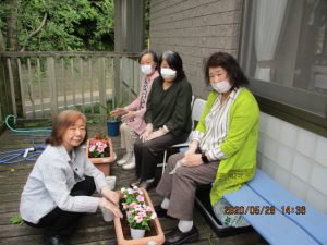ゴーヤーだけでなく、女性陣は日日草も植えました。