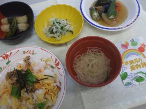 本日のメニュー あなごの五目ちらし、すまし汁、山芋の短冊揚げ、夏野菜の炊き合わ