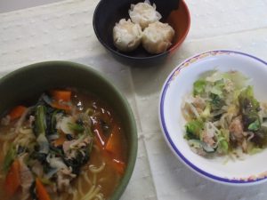 本日のメニューは、“味噌野菜ラーメン・蒸しシュウマイ・大根とツナの中華和え”でした。
