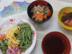 本日の昼食は、『七夕そうめん・厚揚げとゴーヤの炒め物・もずくトマト』でした。