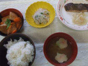 本日のメニューは、“ごはん・みそ汁・カレイの山椒焼き・がんもの煮物・白滝のたらこ和え”