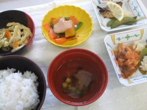本日のメニューは、“ごはん・コンソメスープ・マカロニソテー・温野菜サラダ”に、主菜
