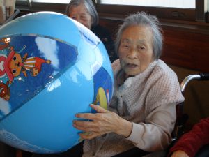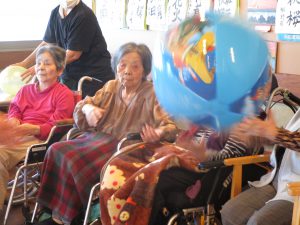 皆さん元気にラジオ体操をされ、いざ運動会開始。大玉送りや玉当て、風船バレーで汗を流されていました。