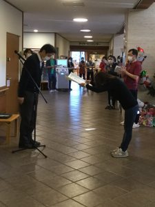 ウイルスの影響があり、ケアタウンの朝礼に参加して頂き、坂本理事長から一人ひとりに表彰状が授与されました。