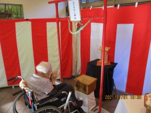 毎年近くの神社へ初詣に出かけていましたが、今年はコロナウイルスの関係で難しく、施設内に職員が手作りの神社を設置しました。クオリティの高い神社に利用者の皆様も大変喜ばれており、お参りやおみくじを引いて楽しまれました。皆様何をお願いされたのでしょうか…?