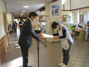 そのためケアタウンの朝礼にて、坂本理事長より区長のメッセージと表彰状が授与されました。