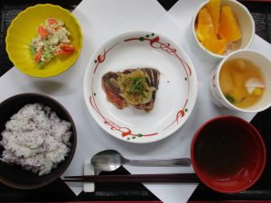 本日のメニューは”ゆかりごはん、すまし汁、かつおのたたき、茶わん蒸し、そら豆の白和え”でした。